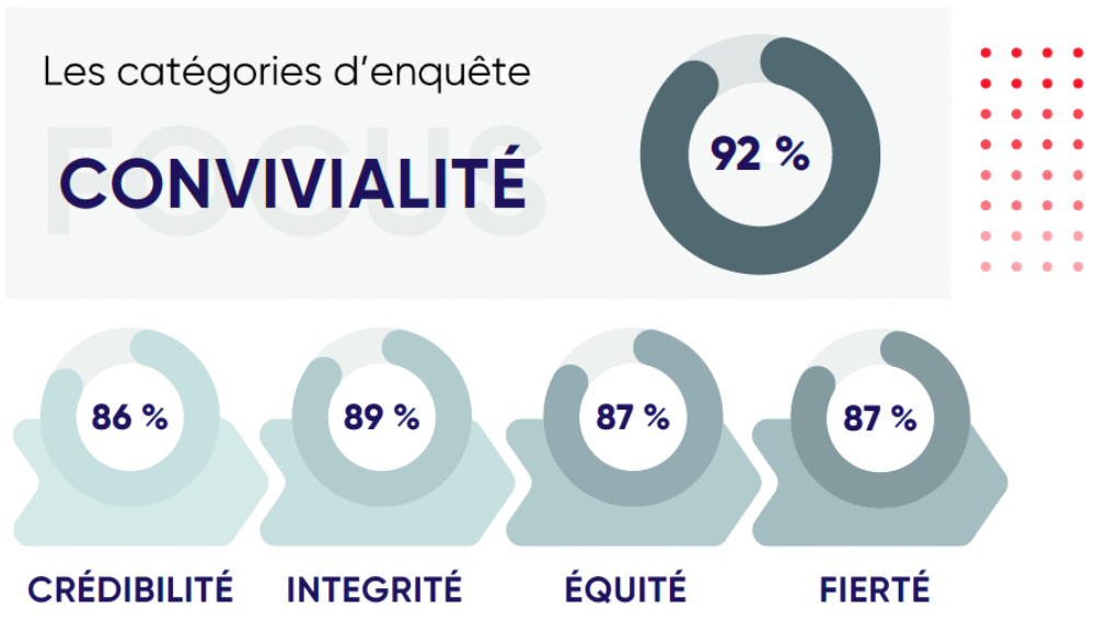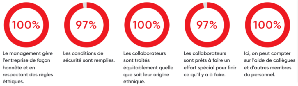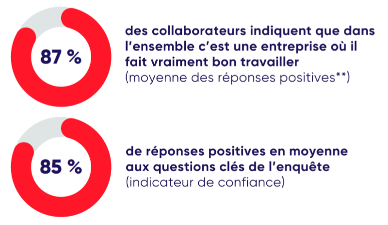La moyenne globale du modèle Great Place to Work® ressort également à 85 %, confirmant la solidité des fondations culturelles de l’entreprise, autour de trois piliers clés : la confiance, la fierté et la convivialité.