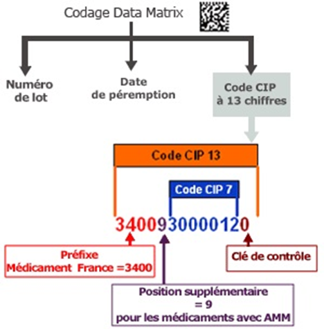 - 7 chiffres : code CIP 7, identifiant spécifique de la présentation du médicament (forme, dosage, conditionnement) ;