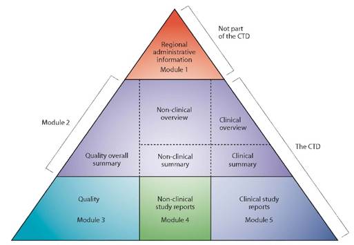 En Europe, les informations relatives à la qualité, à la sécurité et à l’efficacité du dossier d’Autorisation de Mise sur le Marché (AMM) des médicaments sont regroupées dans un format commun, appelé format CTD (Common Technical Document). Le format CTD s’applique dans toutes les régions reconnaissant les textes de l’ICH. Il est actuellement organisé selon cinq Modules : le Module 1 est spécifique à la région tandis que les Modules 2, 3, 4 et 5 sont communs à l’ensemble des régions (cf. figure 1).