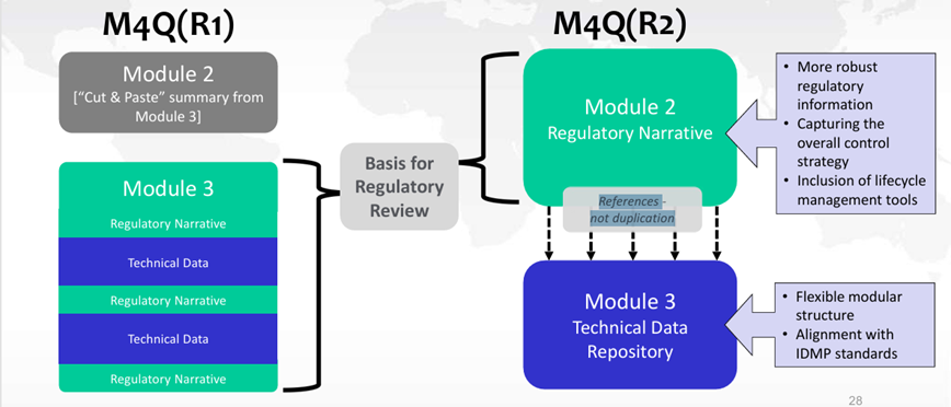 En Europe, le contenu du Module 2.3 (QOS – Quality Overall Summary) et du Module 3 du dossier d’AMM répond aux exigences détaillées dans les lignes directrices ICH M4Q(R1) mises en œuvre en juillet 2003. Aucune révision de ce texte n’a été effectuée depuis plus de 20 ans, ce qui a conduit les législateurs à plusieurs constats :